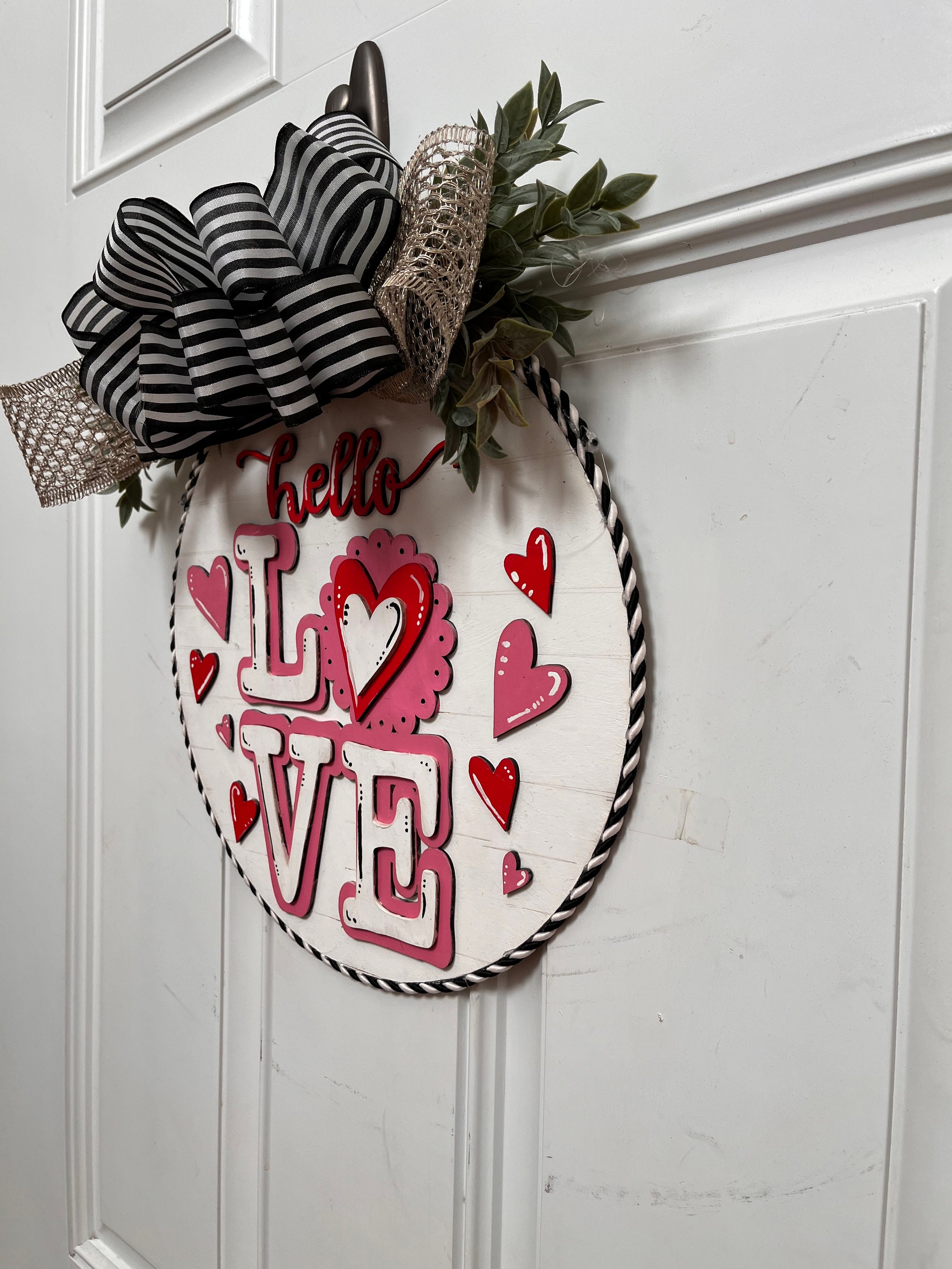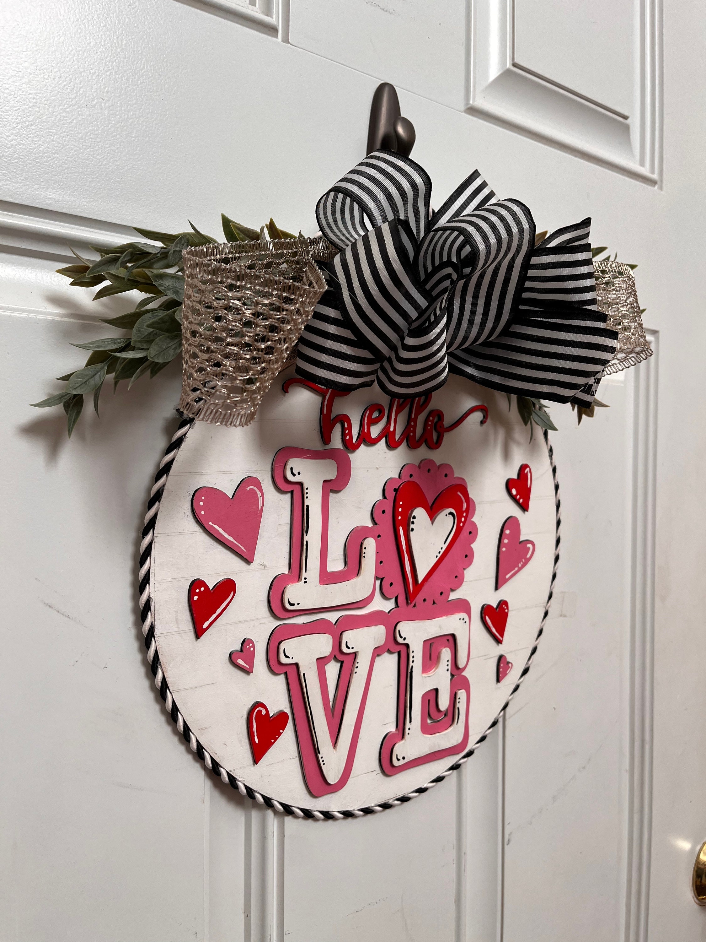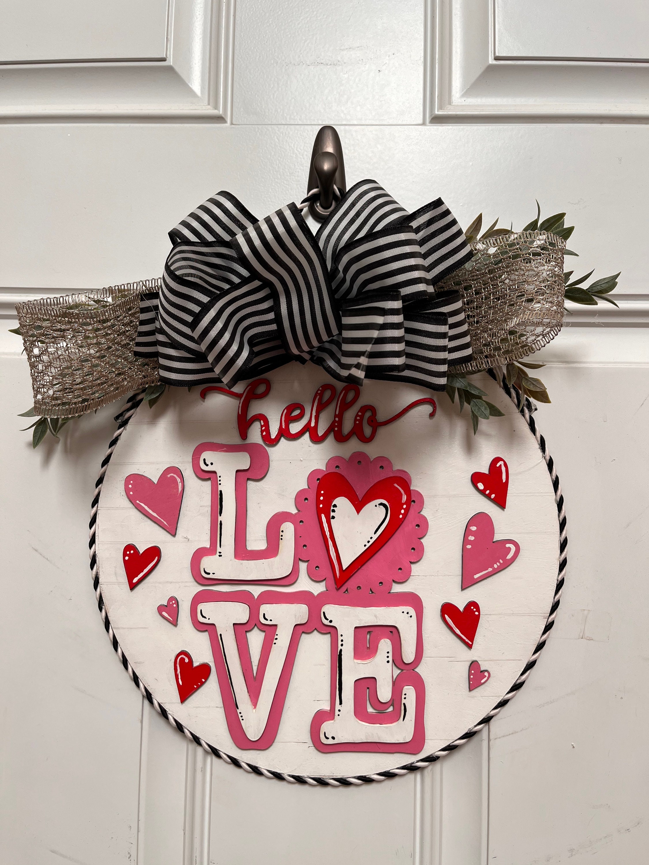 Elevate your Valentine's Day decor with our exquisite 12-inch round door hanging art. Crafted from high-quality wood, this piece is meticulously hand-painted to capture the essence of romance. Precision-cut with a laser cutter, the intricate details showcase a perfect blend of craftsmanship and technology. Adorned with charming Valentine motifs, this artful creation is a timeless expression of love, adding a touch of warmth and charm to your home's entrance. Celebrate the season of love with this unique and beautifully crafted Valentine's Day door hanger.