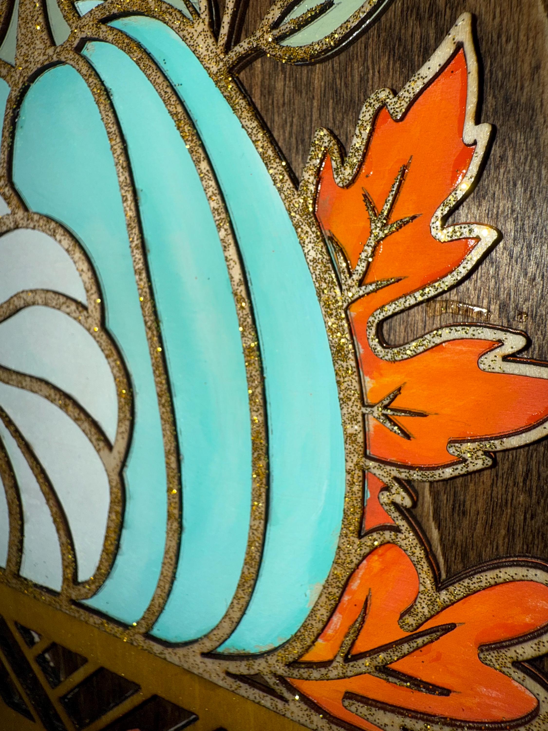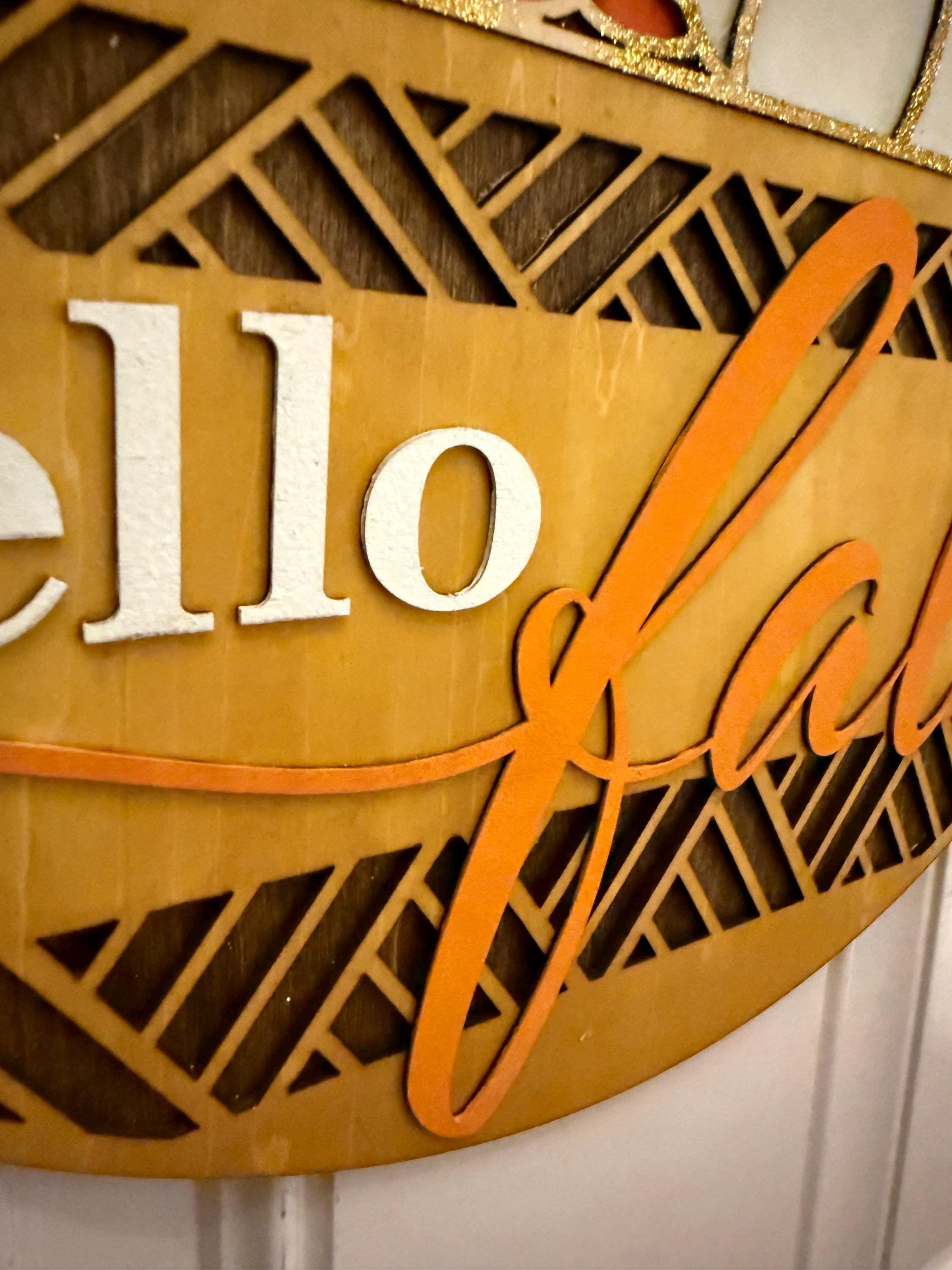 Welcome the cozy season with our handcrafted โHello Fallโ pumpkin door hanger! ๐ This stunning round sign features vibrant pumpkins in orange, cream, and teal, layered over rich fall foliage with intricate gold detailing. Perfect for creating that warm, inviting autumn vibe on your front door, porch, entryway, or wall dรฉcor! ๐กโจ
