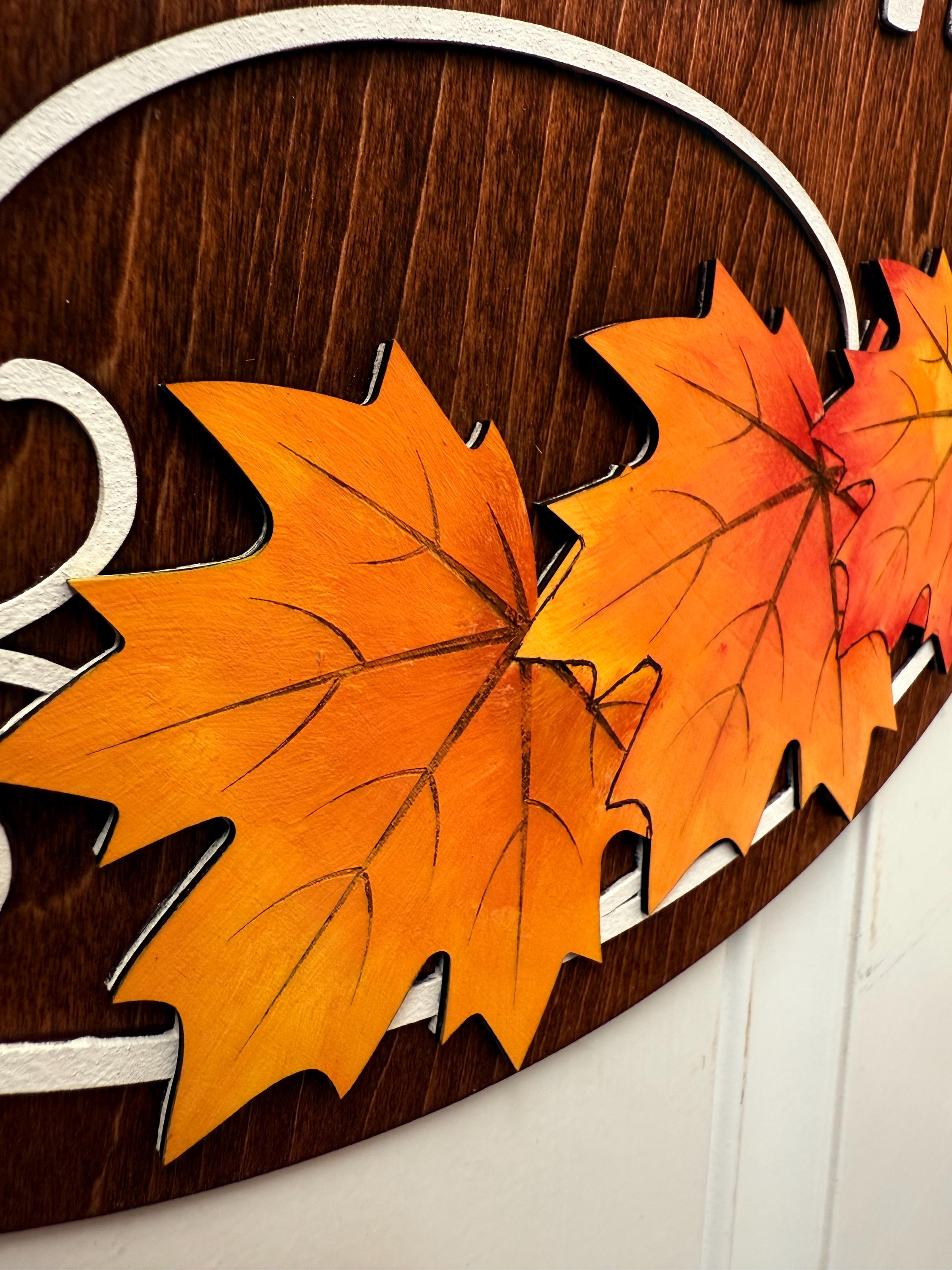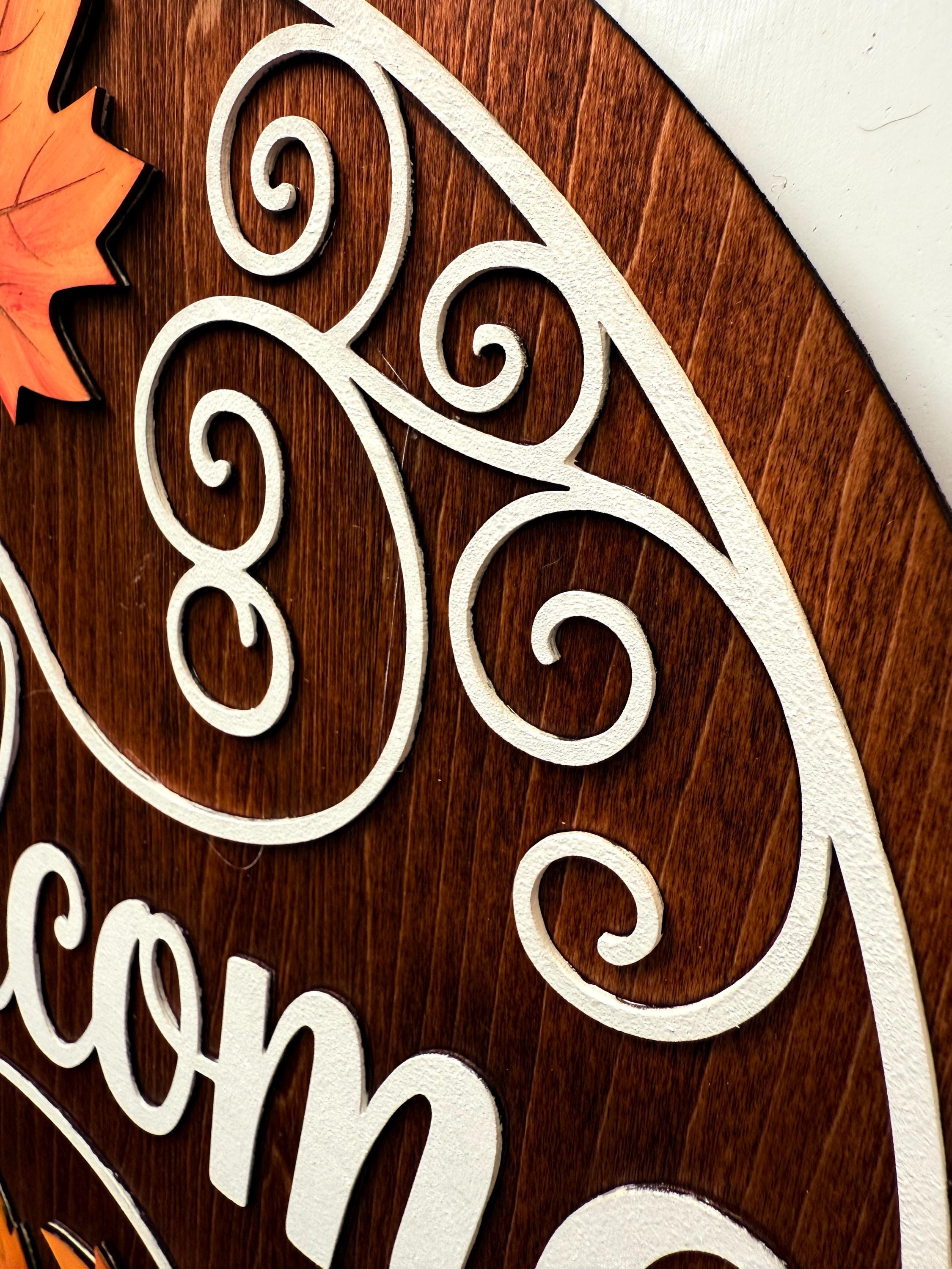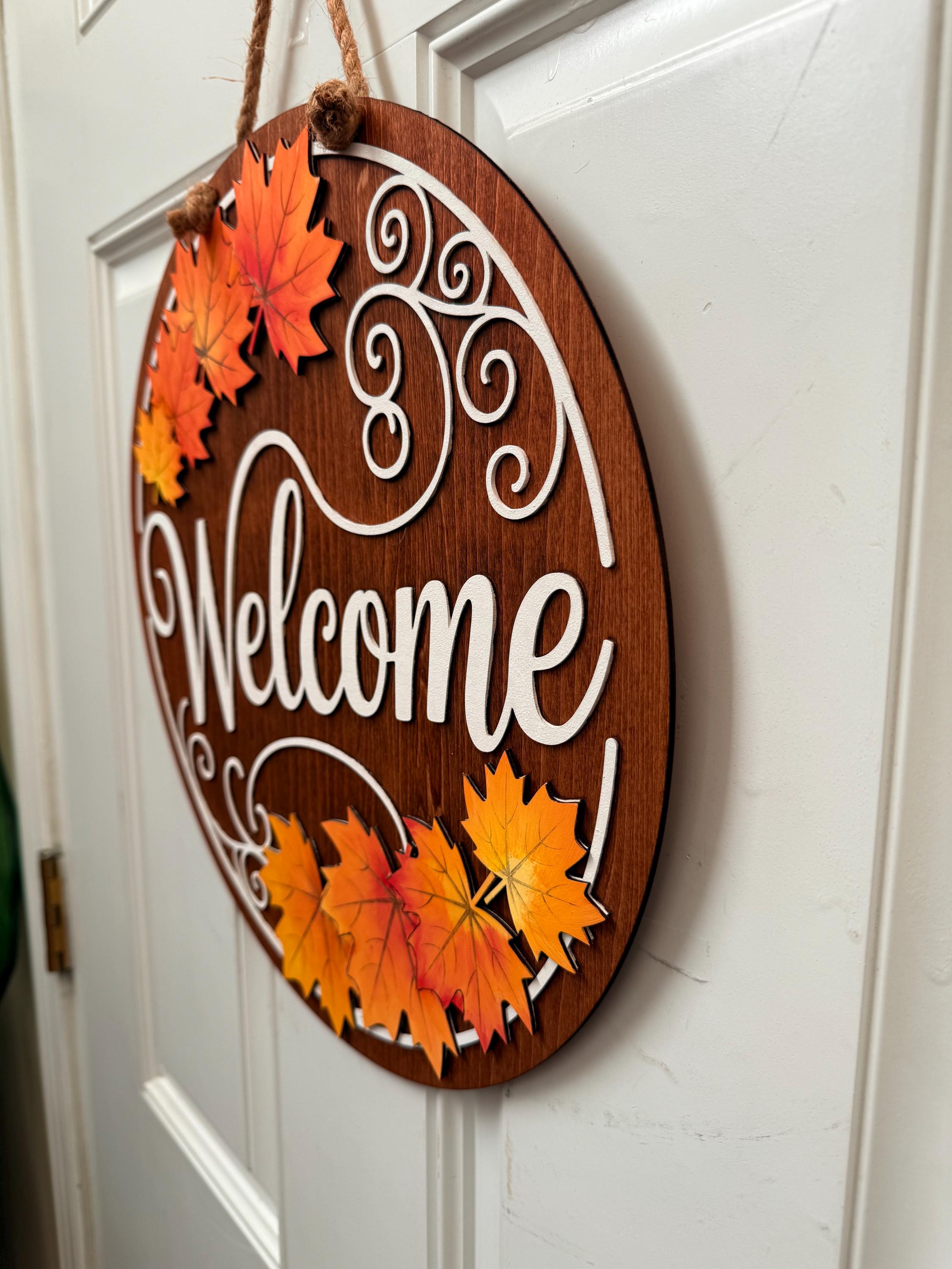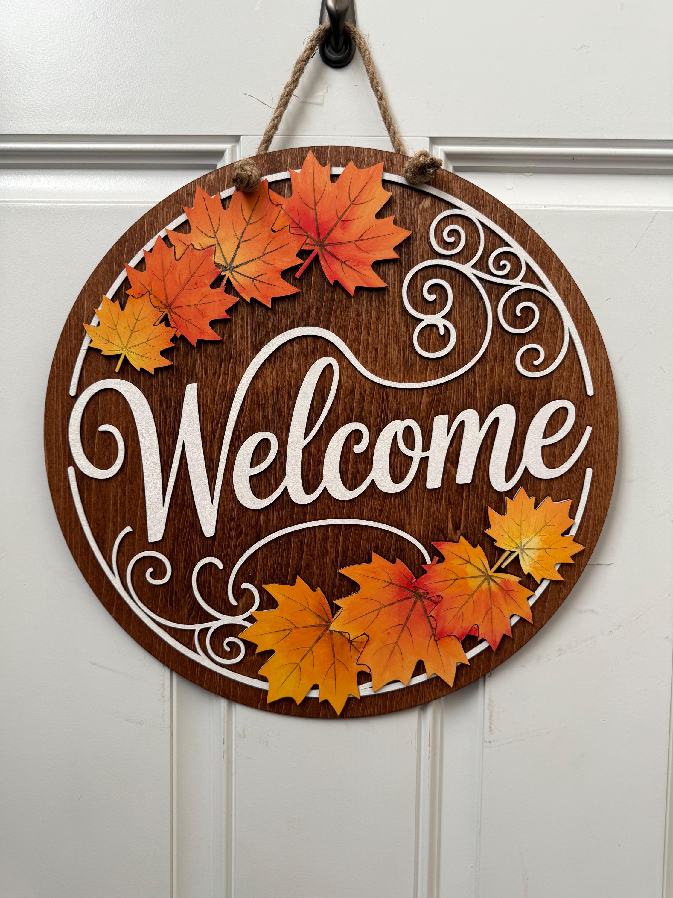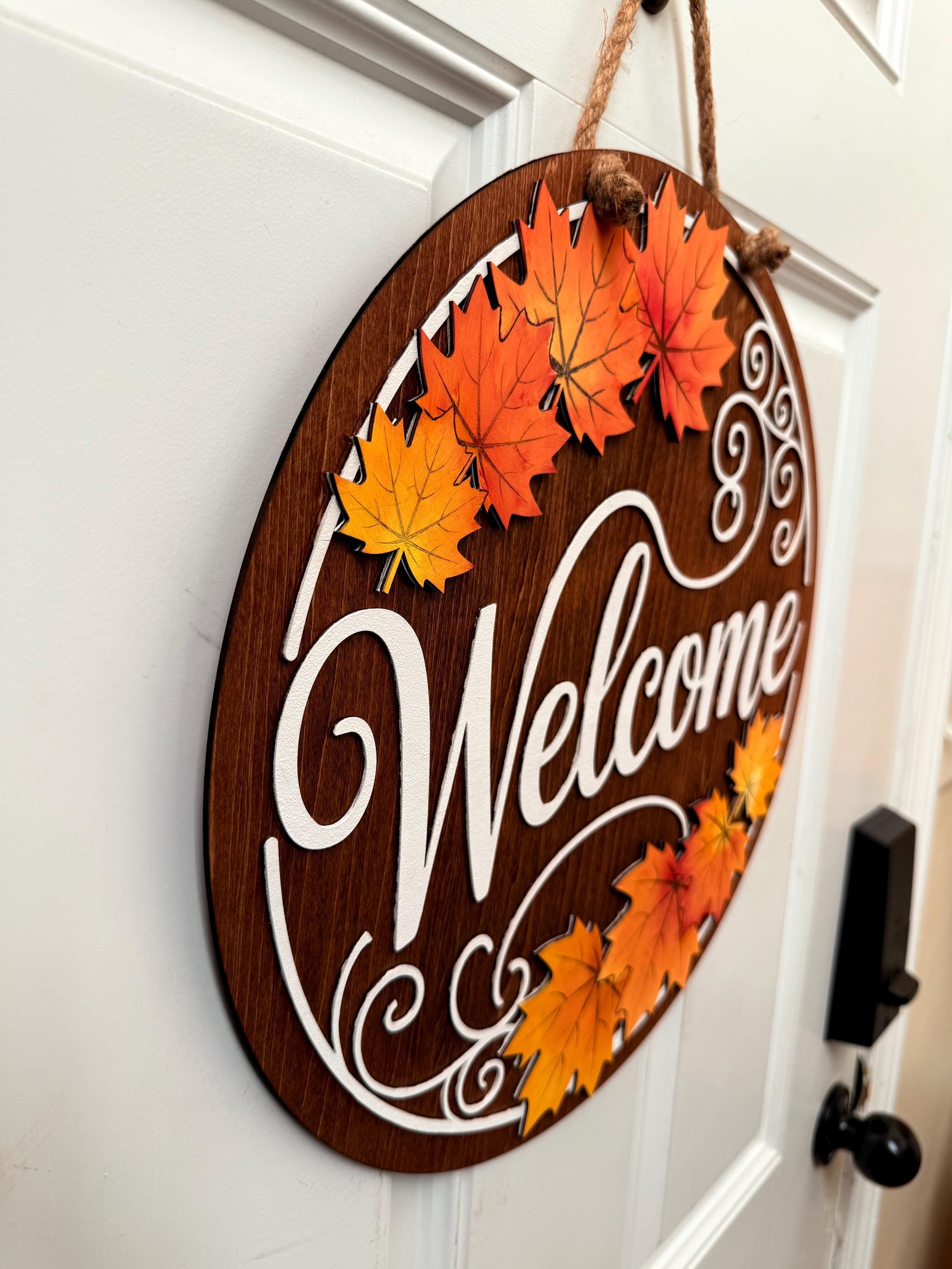 Bring the warmth of autumn right to your doorstep with this handmade wooden โWelcomeโ sign, perfect for greeting guests all season long! Crafted from high-quality wood, this round sign features a rich stained background, elegant white script lettering, and charming swirl accents. The design is beautifully finished with vibrant realistic maple leaves in shades of orange, yellow, and red โ capturing the cozy colors of fall.
