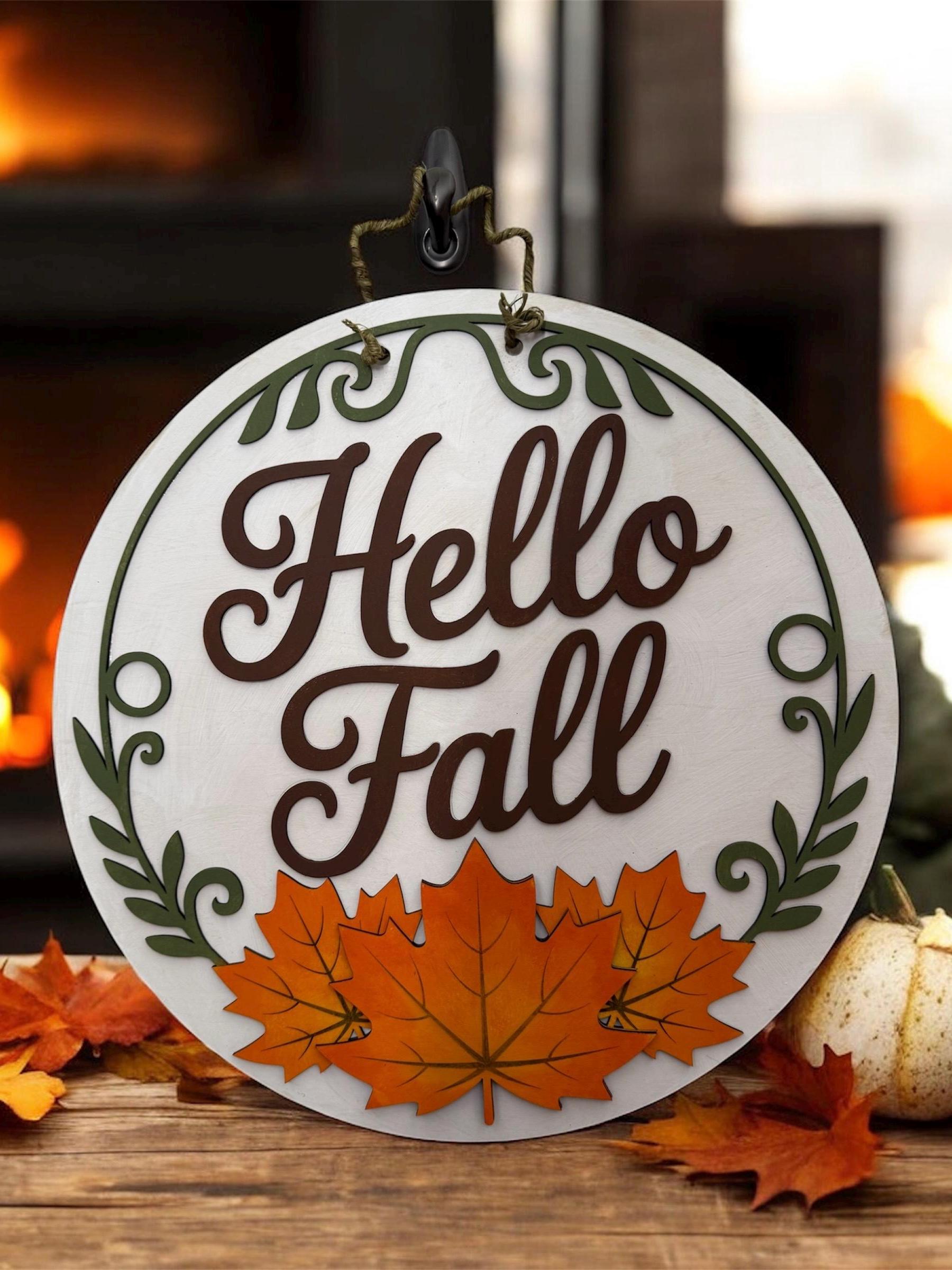Hello Fall Door Hanger β Wooden Autumn Front Door Sign with Maple Leaves β Rustic Farmhouse Fall Porch Decor β Round Seasonal Wall Hanging